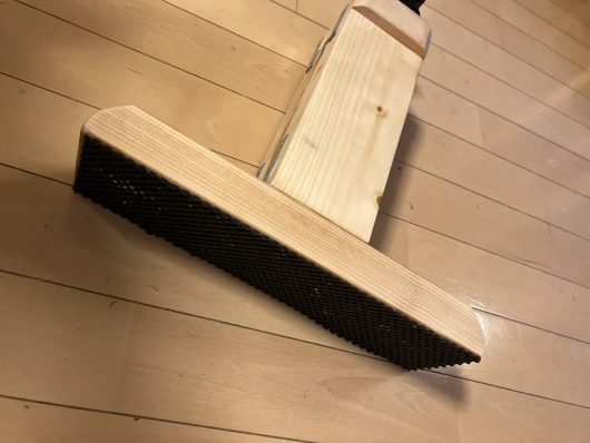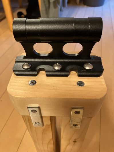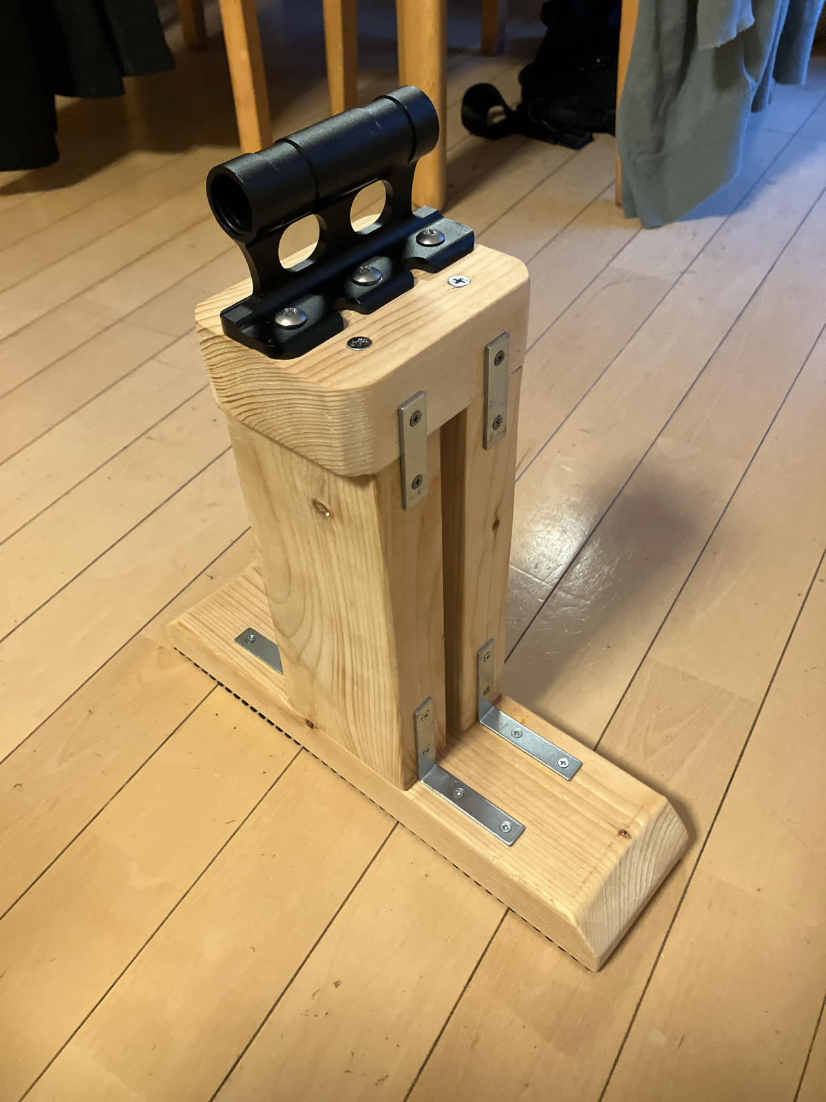 イマムーの依頼で、フロントフォークマウント(スマートローラー用前輪台座)を作成。フロントホイールを代替えするスタンドです。今回の金具部分はスルーアクスルも使用できるようになっております。過去に作った1号機の使用感的には2×4の木材1本でも荷重強度は大丈夫。でもアリエクで買った金具の幅が大きかったせいで、柱部分が2本になっております。家にあった端材で作ったのでこんな感じになりました。ハブの高さは340mmにしてあります。汗で濡れてもいいようにオイルフィニッシュしてあります。金具や上面以外の木ネジはステンレスじゃなくユニクロなので、汗かけたら錆びるやも。金具自体の強度は・・・・正直使ってみないとわからないw。