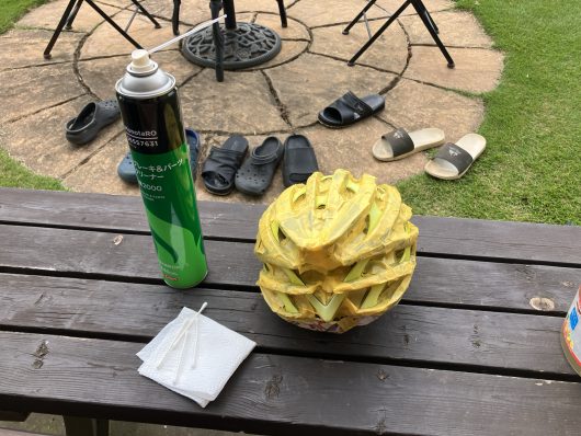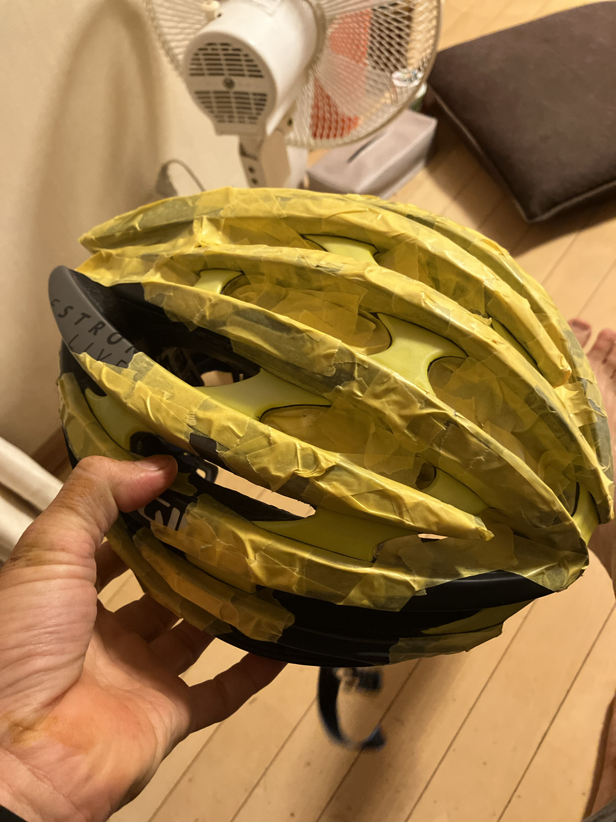 GIRO aeon ヘルメット塗装 DIY 2025.10.23 GIROのaeonの黄色い部分が日焼けしてしまったので、塗装することにしました。最近はこういった派手なカラーリングも減ってモノトーンな感じの物が多い気がします。なんで黄色の部分は黒に。色が抜けたGIROの字はガンメタに変えます。 〈作業工程〉 1、洗浄 2、600番サンド処理 3、マスキング 4、黒マット塗装 5、艶なしクリア塗装 6、カッティングシート貼付 7、コーティング剤塗布 まだマスキング途中。穴が多いのでピンセットを駆使してマスキングテープ貼ります。大変。