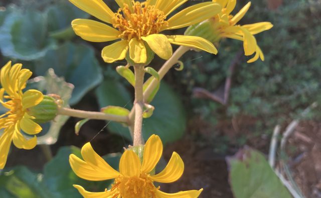 寒さに耐え花を咲かせています。ツワブキバコパ。この季節限定ってわけでもなく、花期が長い。