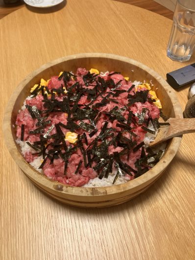 今日は本マグロの中落ちづくし ご飯・料理 2025.12.05 本マグロの中落ちを山盛りで690円でゲット!お昼も夜も中落ちでお安く大満足。2日後に予定していた息子の生誕祭は手巻き寿司改焼き肉パーティになりました(笑)。 昼。1/3分位。 夜、残り2/3
