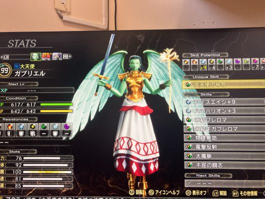 一人目、大天使ガブリエル。攻撃の要。氷結スキルを+9にして、プロレマも2つつけました。物理無効と電撃反射の防御スキルもつけてます。保険で大魔脈と不屈の闘志をつけました。まだ物理反射の写せ身を手に入れることができていないので、物理耐性は無効です。