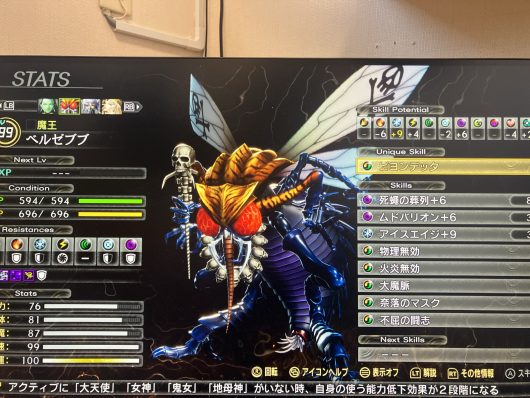二人目。真・女神転生3から変わらぬデザインのベルゼブブ様。こちらもアタッカーとして大活躍。プロレマ入れてないので、ガブリエルの火力の75%位しかダメージ出ませんでした。氷結スキルを+9にしてます。アナンタ対策で呪殺スキルを+9しておけばよかったんですが忘れました。呪殺スキル+9ならもしかしたらムドバリオン一発でアナンタを狩れたかもしれません。けどまぁなんとかなりました。物理無効と火炎無効をつけています。電撃吸収がシヴァ戦では活躍します。