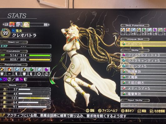 ずっと活躍し続けてくれております、クレオパトラ様々。ファイナルヌード、シヴァ先生にも魅了をつけてくれたりと大活躍。ラスタキャンディとメディラマでMP枯渇しましたが、それでも途中でチャクラポッドとかでなんとか乗り切れました。ターンタヴァ対策でデクンダは必須でした。普段は回復枠でコノハナサクヤを使っているのですが、シヴァ戦では主人公とクレオパトラ様に回復役を担ってもらうべく、急遽メディラマをつけました。メディアラハンはオーバースキル過ぎてMPを無駄遣いすることになるので、基本メディラマで大丈夫です。呪殺弱点残ってしまっていますが、シヴァ戦では無問題。普段は電撃無効ではなく呪殺無効を入れています。ヨシツネなども呪殺弱点ですので、この弱点を放置しておくと、キウンあたりに瞬殺されます。