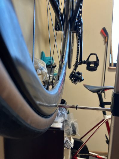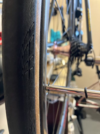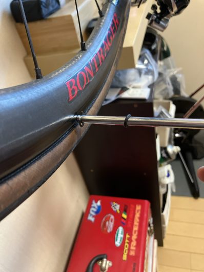 修正後の画像がこれです。エンドがホイールに対し平行に修正されました。今回の修正は目視での差がわからないほどバシッと決まってます。この工具での修正作業は最小最大が2㎜以内となるようにするとどこかで聞いたことがあります。