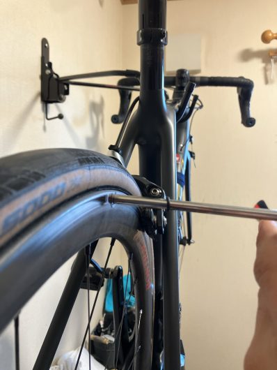 ホイールとの距離を測る部分を、一番内側になるところに合わせます。今回一番ホイールに近づいたのは、円を時計でいうと6時30分くらいの位置です(3時方向敵機来襲的な)。