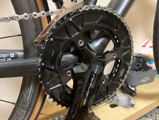 最近はSTONEのチェーンリングを見慣れたので、これが普通な感じがします。スチールチェーンボルトで13kNで締めています。スチールチェーンボルト使うようにしてから、高トルクでの異音が無くなりました。アリエクとかで売ってるアルミのチェーンボルトは全く信用なりません。